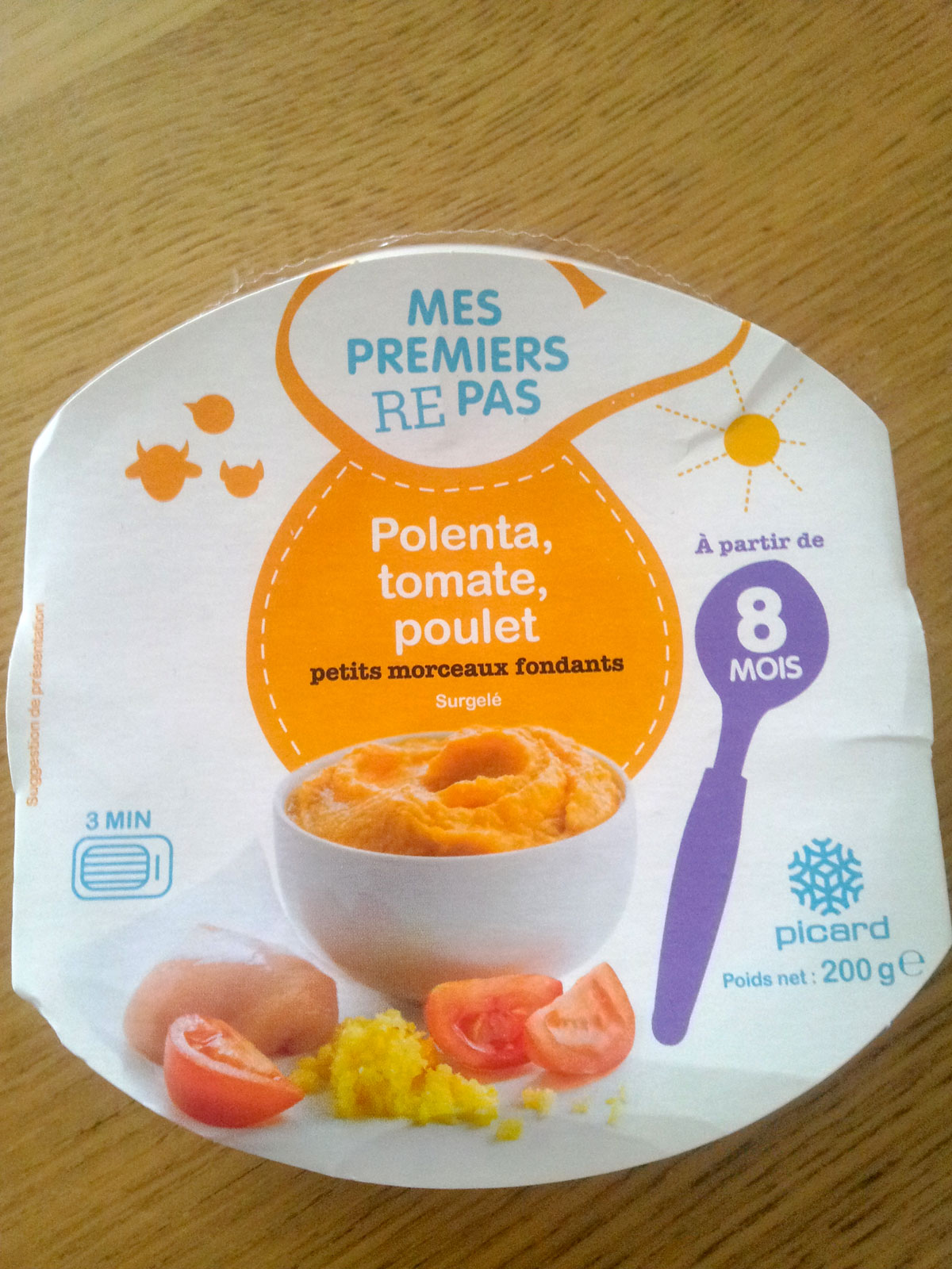 Résultat des courses; j’ai fini par acheter un plat de polenta, tomate, poulet surgelé de leur gamme Mes Premiers Repas et la ….(roulement de tambours) …SURPRISE! CA SENT LES LÉGUMES et le petit plat est savoureux (bon, pas autant que les plats maison, c’est sûr, mais cela s’en rapproche)! Du côté des ingrédients pas trop mauvais non plus : Polenta cuite 30% (eau, semoule de maïs 7,5%), eau de cuisson, viande de poulet 8%, patate douce, carotte, tomate 6%, lait écrémé réhydraté, oignon, concentré de tomate 4%, crème liquide.